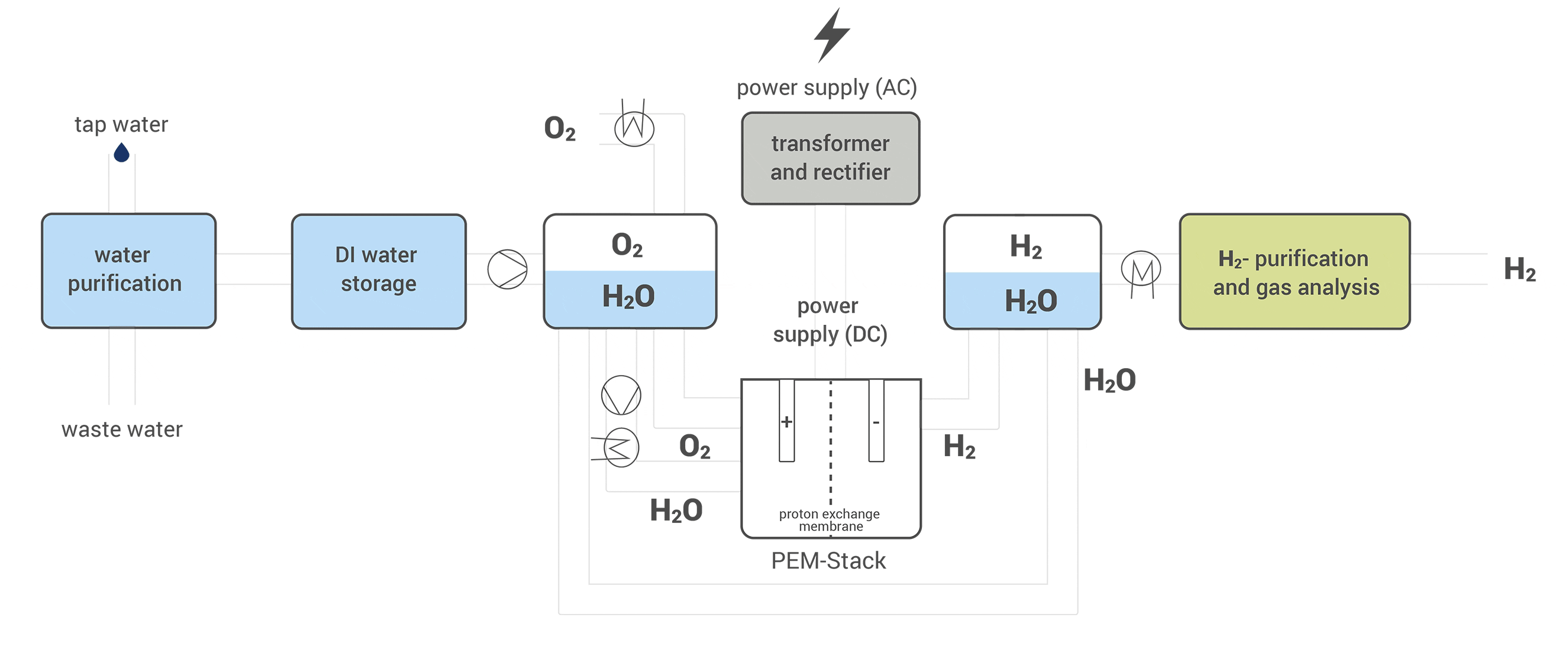 Water quality is crucial, as impurities can damage the membrane and catalysts. The ultrapure water is fed into a circuit that includes the oxygen tank, pumps, heat exchanger and PEM stacks.